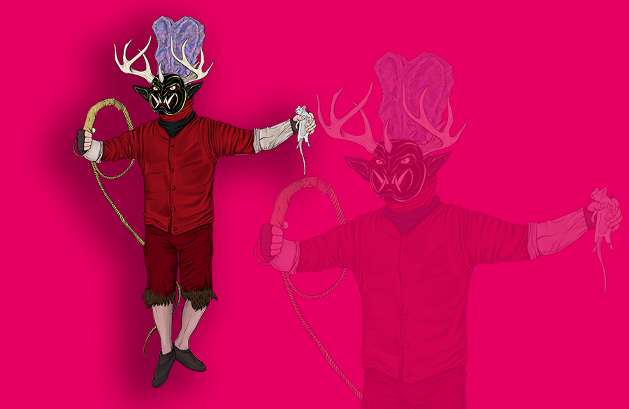 Careta, tridente, prenda que cubra la parte inferior roja o negra, botas de cuero, cola de caballo, espuelas. Accesorios: dinero falso, condones, fotografías obsenas o pornográficas, licor y tabacos.