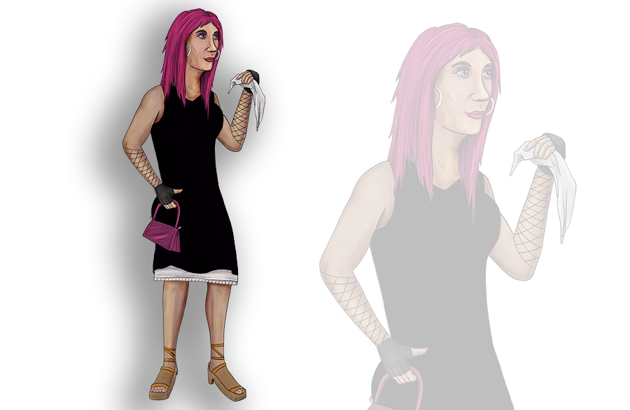 Peluca, careta, maquillaje, velo, vestido negro o minifalda, medias nylon, tacones o zapatos de mujer.